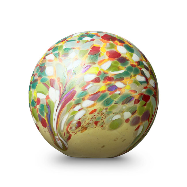 De Elan-line urn bloemenveld is een prachtige, bolvormige urn van hoogwaardig kristalglas. Het ontwerp is geïnspireerd op een weelderig veld vol kleurrijke bloemen, met een schittering die doet denken aan zonnestralen. Dit bonte kleurenspel is gecombineerd met een subtiele parelmoerglans en fijn reliëf, wat de urn een levendige en unieke uitstraling geeft. De urn heeft een inhoud van 4 liter en is voorzien van een discreet as-reservoir dat wordt afgesloten met een zelf-hechtende sluitplaat.